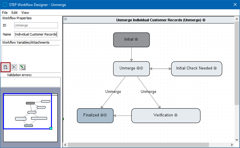 Workflow-based unmerging is intended to add a level of control to the unmerge process by initiating a merged record into the initial state of the unmerge workflow where a knowledgeable user can decide to continue or exit the unmerge process. This workflow setup is optional since users can perform ad hoc unmerge operations, refer to the topic Unmerging Golden Records.