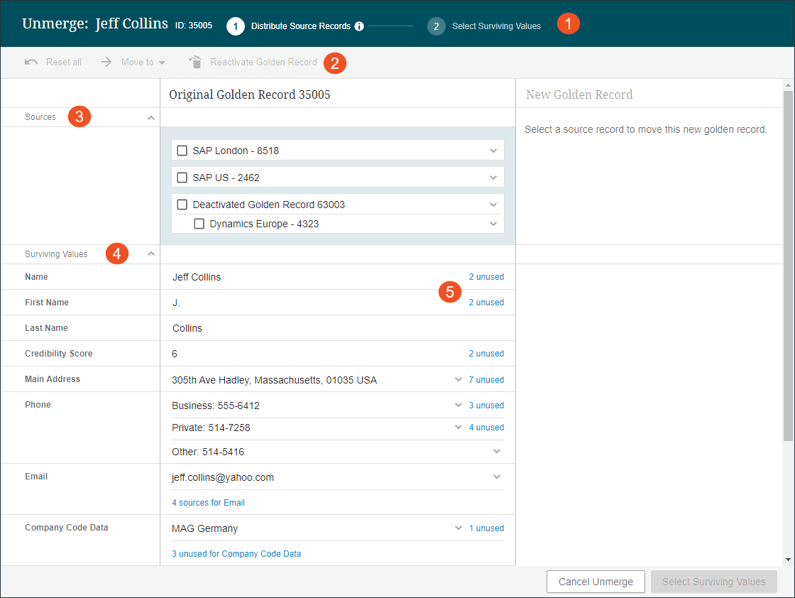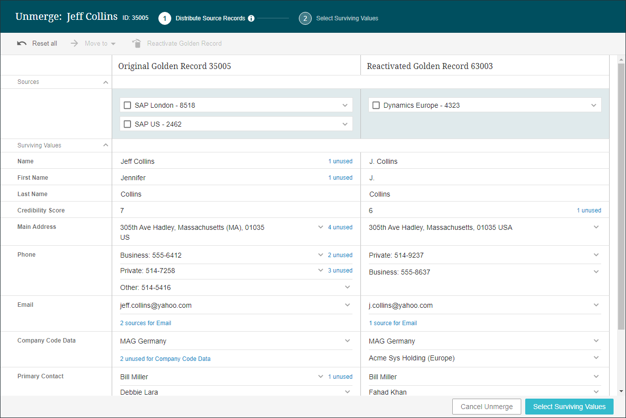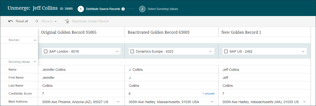 Review the assigned values, the unused values, and the unused references calculated by Unmerge for the original selected golden record and the one being reactivated.