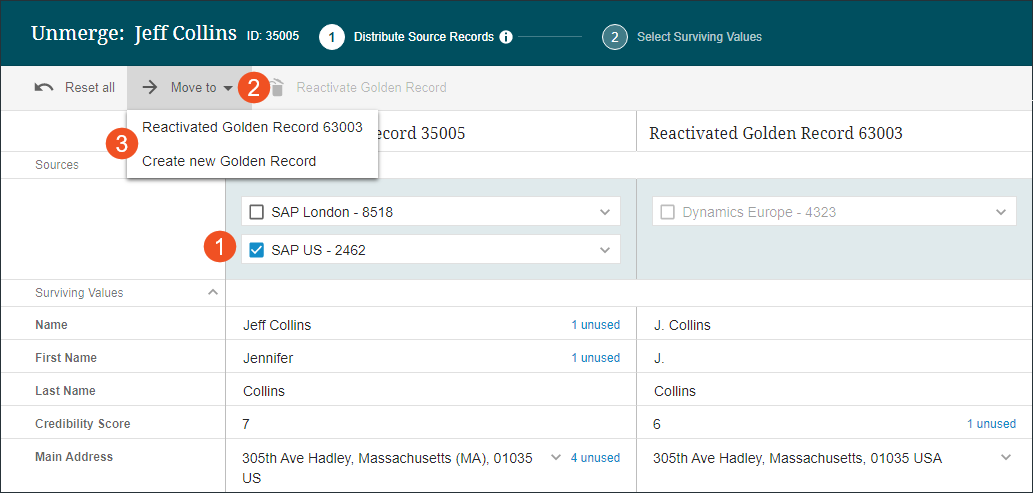 - Move to: moves the selected source record(s) to another golden record or creates a new golden record. Refer to the Moving a Source Record section below.