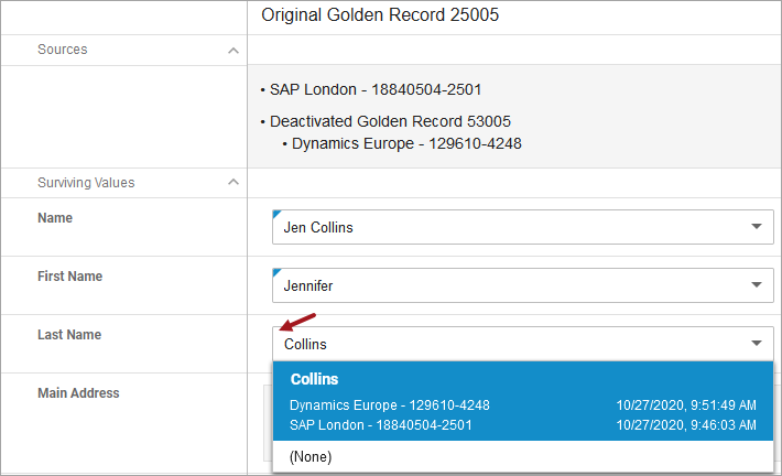 Once the new golden record is created, either from a merged record or a reactivated golden record, clicking the 'Select Surviving Values' button on the Distribute Source Records step displays the Selecting Surviving Values step.
