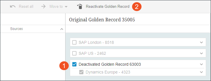 - Reactivate Golden Record: reactivates the selected golden record that was previously merged into another golden record. All source records associated with this record are also moved. Refer to the Reactivating a Golden Record section below.