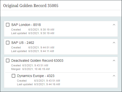 - Sources - records used to determine the original record. This section shows all deactivated golden records that were merged into the golden record being unmerged. As shown below, expand a record to display additional information.