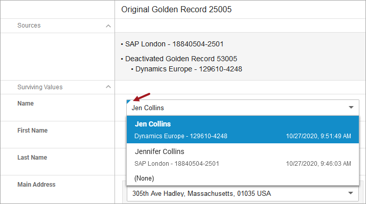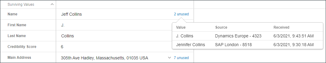 Blue link text on a surviving value row (the Name row in the image above) shows the number of unselected attribute values associated with the record that did not survive. Click the link to display a popup that includes details.