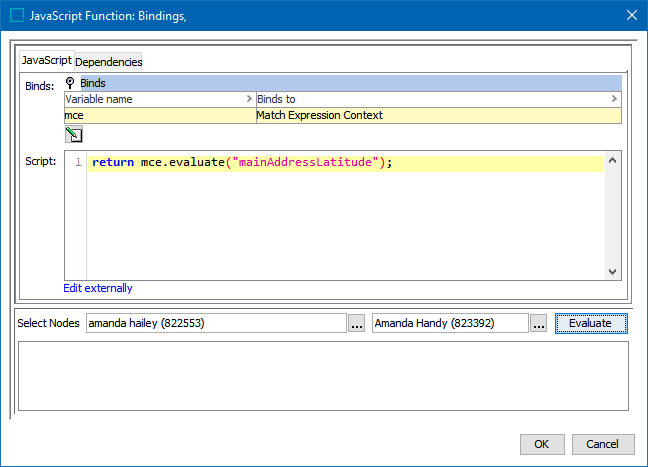 The JavaScript function is constructed around the Match Expression Context. For more information, refer to the topic Matching Algorithms and Match Expressions.