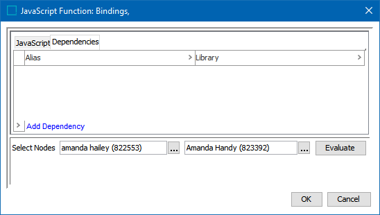 Click the Dependencies tab, click the Add Dependency link to select any libraries required for the script added on the JavaScript tab.