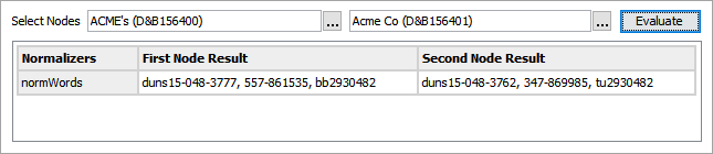 Matching on DUNS numbers would start with the words normalizer replacement table removing unwanted characters and substrings like the 'DUNS' prefix. It might be necessary to chain a business function after the words normalizer to remove prefixed zeros.