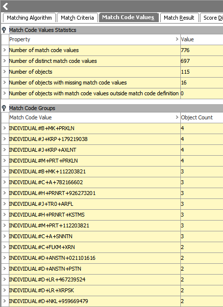 On a running system, match code values can be examined in the workbench using the match code values tab on the matching algorithm. Match codes are expected to be relatively unique. A group of equal match codes is referred to as a match code group, which should be small. No match code group size should be larger than 100 and generally, most objects (95 percent) should be in a match code group with a size of 10 or smaller.