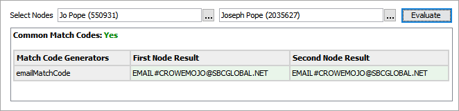 The Common Match Codes parameter displays 'Yes' when the same match code is generated for the selected nodes. When 'No' is displayed, either one or both nodes have no value, or when the generated match codes are not the same.