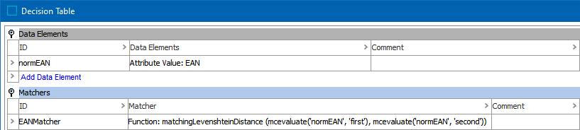 The Function Matcher shown in the section below uses a Levenshtein distance, which is a metric for how many edits (substitution, insertion, deletion) it takes to make one string look like another. For example, the Levenshtein distance between the strings 'AXR55487' and '8XRT5487' is 2 because the first and fourth digits are different. In STEP terms, the strings would be 75 percent alike (6/8*100). The example below matches for European Article Number (EAN) and performs a comparison of the EANs in two objects. The matcher does not handle special cases, such as where the normalizer returns strings that are obviously not EANs, like empty strings, because resolving such cases is expected to be handled by the normalizer.