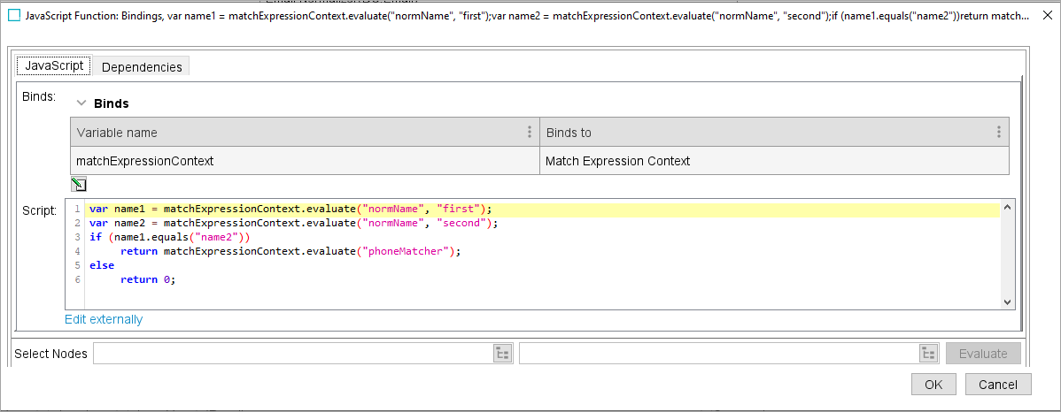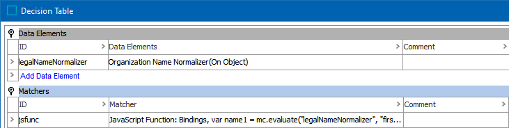 A JavaScript Function Matcher uses the Match Expression Context 'evaluate' function to assess elements from the Data Elements section and Matchers section of the decision table and compare their results.