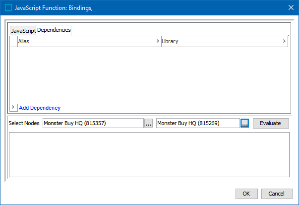 3. Click the Dependencies tab, click the Add Dependency link to select any libraries required for the script added on the JavaScript tab.