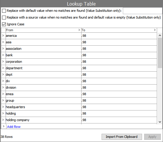 A Word Alias Table can be used to perform case-insensitive matching by alias. The Customer & Supplier MDM Configuration Guide in the Solution Enablement documentation refers to a Word Alias Table (illustrated below) that allows the matching to handle common organization word substitutions like 'co' with 'company'. For more information, refer to the topic Transformation Lookup Tables in the Resource Materials online help documentation.