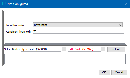 0.0 is displayed when a value is not available in one of the selected nodes or when the phone numbers do not match. Adjust as indicated by the Evaluator results and repeat the evaluation.