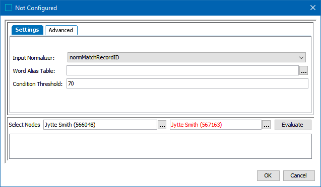• For the optional Word Alias Table, click the ellipsis button () and select a Transformation Lookup Table to substitute words with the same or similar meaning. The optional Name Word Splitter Regex runs before applying the Word Alias Table. Refer to the Considerations section above.