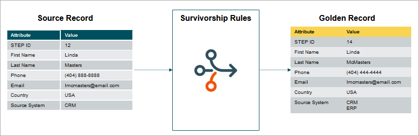 In match and merge, survivorship rules promote information from exactly one source to exactly one target by comparing information from the source with information from the target and writing the relevant updates to the target.