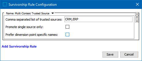 Promote single source only - When checked, content from the most trusted source is used for all contexts / qualifiers, which prevents empty values in the golden record as long as one of the trusted sources has content. For example, when only the French language / France country context has a value, that value would be written into other contexts that are blank.