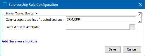 Comma separated list of trusted sources - Enter a comma-separated list of the case-sensitive Source System ID for all trusted sources, starting with the most trusted source, then the next-most, and so on. Content is taken from the first trusted source with data. If content does not exist for any of the trusted sources, nothing is promoted to the golden record and the existing golden record value is cleaned. For information on the Source System ID Attribute setting, refer to the topic Configuring the Matching - Merge Golden Record Component Model.