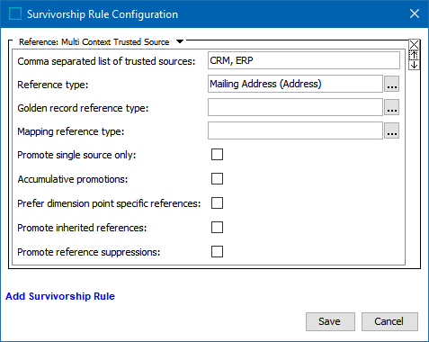 Accumulative promotions - When checked, all references / links and their metadata from multiple source records are written to the golden record (including references from different contexts). In a case of a reference / link being single-valued with multiple references in a particular context, the most trusted will be promoted, but if there are multiple references in multiple contexts, all references will be promoted to golden record.