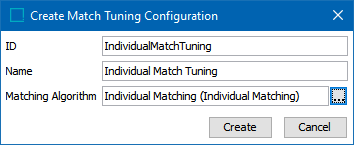 In the 'Create Match Tuning Configuration' dialog, add an ID, a Name, and specify a matching algorithm to test. Click the Create button.