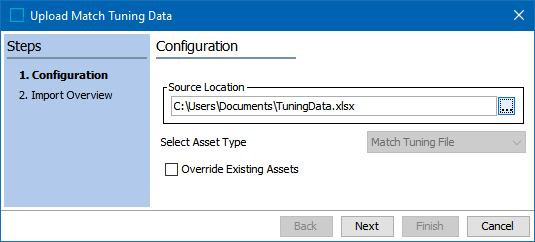 Click the Upload Tuning Data button to display the Upload Match Tuning wizard. Uploading data saves it as an asset in STEP and makes it available for selection in the match tuning configuration.