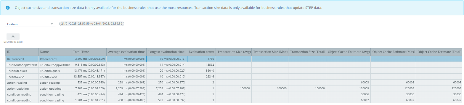 Transaction Size - average / maximum / total number of objects modified in the transaction. This is only available for business rules that update STEP data.
