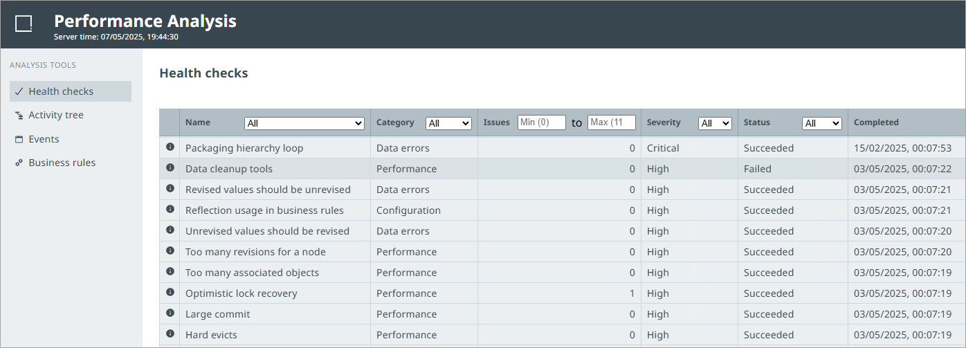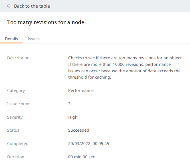 Issues – The number of issues associated with that specified health check. This column can be filtered by a minimum and maximum number of issues.