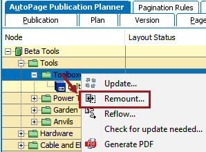 - If using the AutoPage Publication Planner, select the section or objects that you want to remount, right-click, and then select Remount.