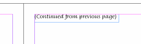 - Draw a text frame at the top of the second page and add the second continuation note. For example, '(Continued from previous page)'.