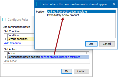 - Click on the hyperlinked 'defined from publication template' text to display the 'Select where the continuation notes should appear' dialog. The available Position options are Defined from publication template (default) and Immediately below product.