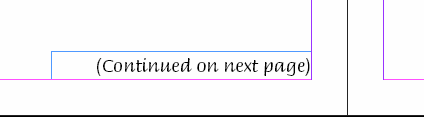 - Draw a text frame at the bottom of the first page of the spread, then add the first continuation note. For example, '(Continued on next page)'.