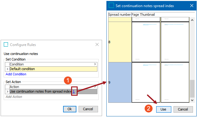 - When 'Use continuation notes from spread index' is selected as the action, the action text will include the hyperlinked number '1.' Click on this number to display the Set continuation notes spread index dialog.