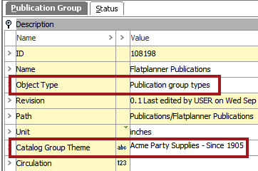 ObtainAttrValueFromPublicationGroup [using the formula getInheritedPublicationValue('CatalogGroupTheme')] will pick up the value of the description attribute Catalog Group Theme (CatalogGroupTheme), which is 'Acme Party Supplies - Since 1905' in this example.