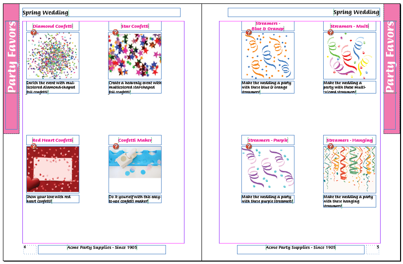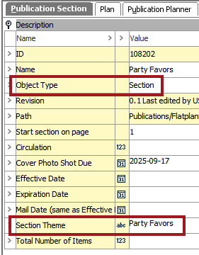 ObtainAttrValueFromSection [using the formula getInheritedPublicationValue('SectionTheme')] will pick up the value of the description attribute Section Theme (SectionTheme), which is 'Party Favors' in this example.