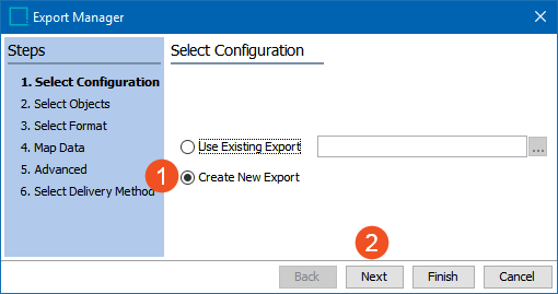 - After clicking Next on the Map Data screen of the Export Manager (step 4), you are taken to the Advanced screen (step 5). All options may be left as-is. Click Next.