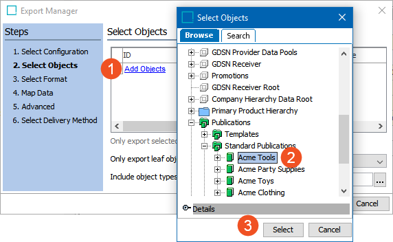 - In step 2 (Select Objects), define the publication from which you would like to export the index. Click Add Objects, search for or browse to the relevant publication in the Select Objects dialog, then click Select.