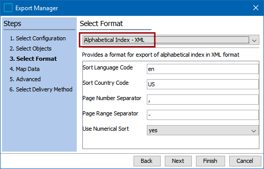 - In step 3 (Select Format), choose Alphabetical Index - XML from the dropdown list.