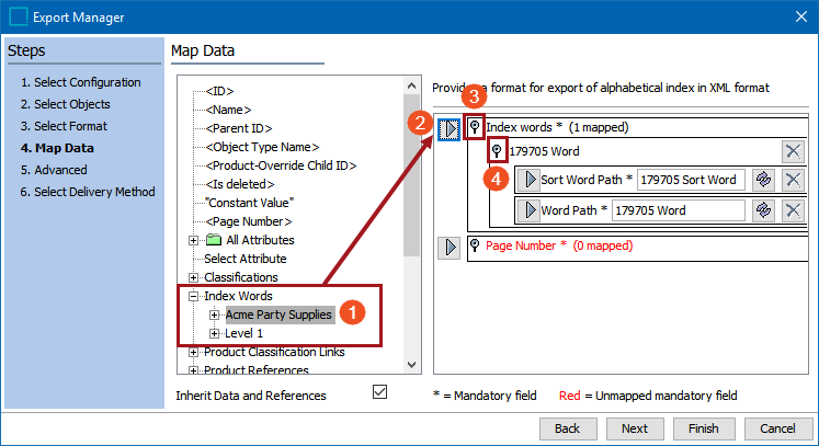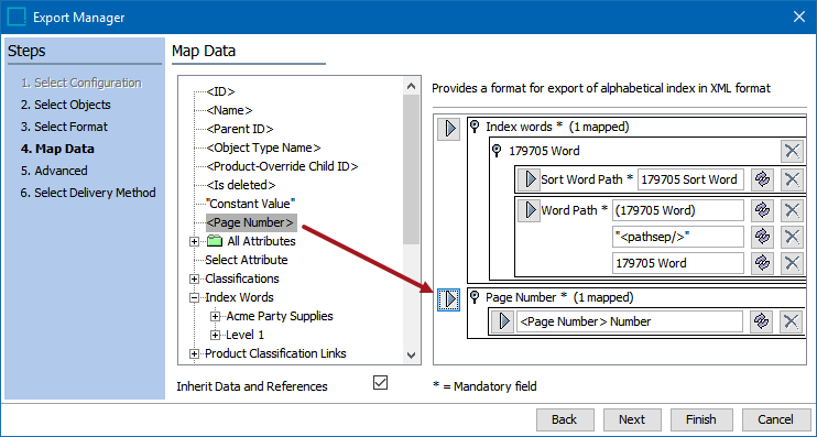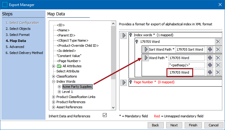 - On the Map Data screen of the Export Manager (step 4), expand the Index Words hierarchy and select the relevant index hierarchy.