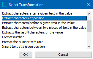 - Select 'Extract characters at position' from the list of transformations. Click OK to return to the Transformations dialog.