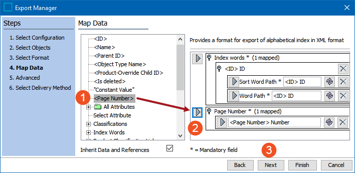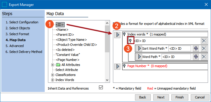 - On the Map Data screen of the Export Manager (step 4), select <ID>, then click on the arrow directly to the left of the Index words flipper.