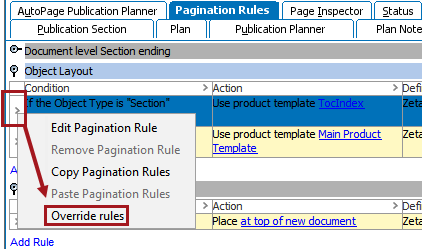 - On the Pagination Rules tab, left-click or right-click on the small arrow icon next to any rule in the group, then choose Override Rules.