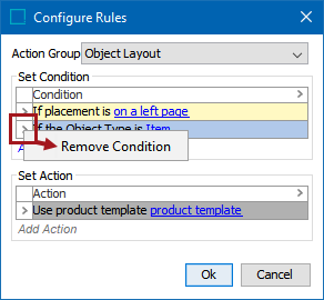 - In the Configure Rules dialog, either left-click or right-click on the small arrow in the row that contains the condition or action to be removed, then click Remove Condition (or Remove Action, for actions).