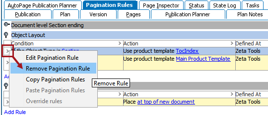 - To delete a condition or action from a pagination rule on the Pagination Rules tab, right-click on the small arrow in the row that contains the rule that the condition or action is applied to, then choose Edit Pagination Rule.