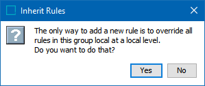 When you add an extra rule to a rule group with inherited rules, you are prompted to accept that all rules in the affected rule group will become local.