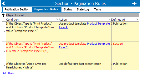 Important: All rules within a pagination rule group are affected when you create a local rule. If you make changes to a rule at the topmost publication level after you have created the local rule, the changes are not inherited. However, if only the actions are changed on the inherited rules, then only the edited rule turns red and this will not break the inheritance of the entire group rule.