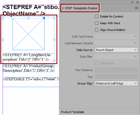 Select Mount Children or a product / asset reference type when the grouped frame is intended to repeat on the page. The frame repeats in instances where information is available from multiple child objects or from multiple referenced products or assets. When selected, the following options are activated in the STEP Template Frame panel: Data Filter, Tile across, Max Distance, and Gap.