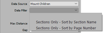 - Data Filter: Only activated when Data Source is 'Mount Children.' Used when mounting publication or section objects to pull information (such as metadata attribute values or section names) from child sections / subsections. Available options are Sections Only - Sort by Section Name and Sections Only - Sort by Page Number. This functionality is typically used in AutoPage publications to create tables of contents / section indexes. Refer to the Creating a Table of Contents Product Template topic for more information.