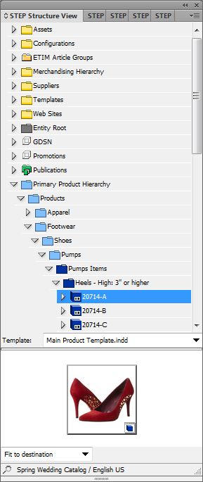 The STEP Structure View InDesign panel (or panel, in InDesign terminology) is used primarily to mount product and classification objects to InDesign pages, though asset references and attributes may also be mounted. Other STEP hierarchies may also be accessed if needed (for example, entities).