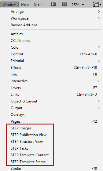 The STEP Structure View is accessed by navigating to Window > STEP Structure View from the InDesign application bar across the top of the InDesign interface.