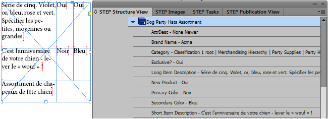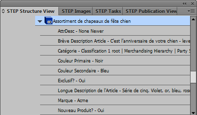 This feature is intended for users who need to view the names of names of attributes, attribute groups, products, classifications, entities, and publication hierarchy objects in a different language than that of the publication version they are currently working with. For example, DTP operators in the US who only speak English may have no understanding of what objects they are mounting if working in a French publication version and all object and attribute names are displaying in French in the STEP Structure View panel, as pictured in the following screenshot.