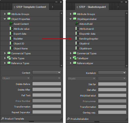 Restart InDesign and the new language will appear throughout the program and on the STEP menus. The following screenshots show examples of Print Publisher menus and panels, in English on the left and Danish on the right.